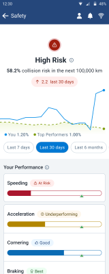 Driver Risk Insights enables personalised, driver-focused analytics to: assess the likelihood of a collision, providing a percentage-based collision risk probability per driver based on driving behaviours and historical trends; benchmark driver performance with similar drivers within their fleet or across different fleets using Geotab’s extensive anonymised aggregate data set; and deliver proactive coaching via the Geotab Drive App, giving drivers feedback and empowering them to improve safety habits to protect themselves.