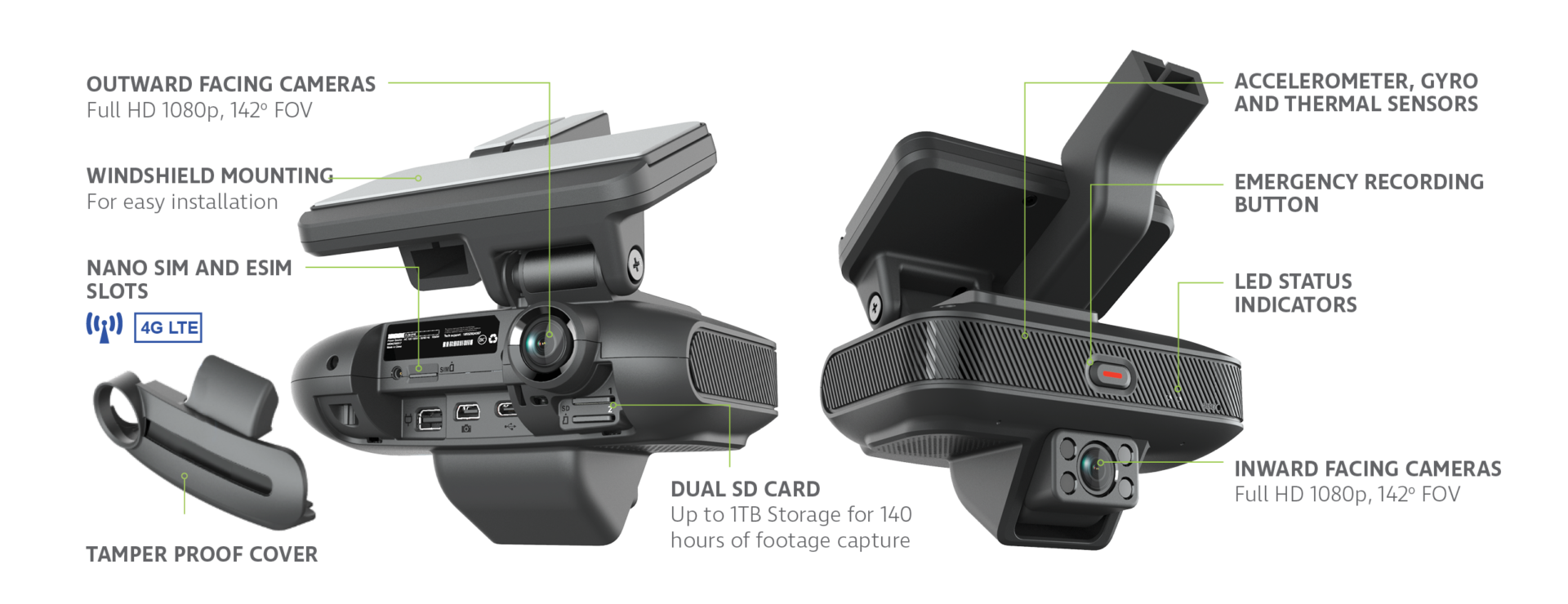 The Multi IQ Camera can connect up to five cameras across the vehicle: cab interior, side, rear, cargo area or undercarriage cameras, alongside its built-in high-definition dual-front and driver-facing dashcam.
