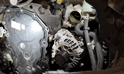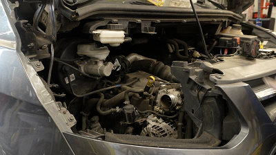 “Reaching the cover is most easily accessed through where the front righthand headlight is mounted, so its removal, along with the air filter assembly, starter motor, auxiliary belt and water pump belt, which, in this instance, must be cut, and the disconnection of several of the cooling hoses, are all necessary steps in the process.