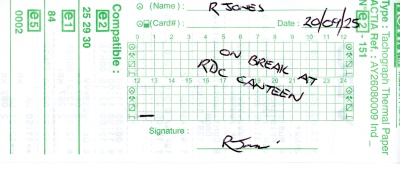 “A printout produced by the tachograph will typically include the date and time it was printed. A manual entry made on the reverse of that tachograph-produced printout can be made at the time in two parts: 1) the explanation, for example, ‘Break taken in RDC canteen’; and 2) the duration, a line on the 24-hour scale between 12:00 and 13:00 to show a full and continuous statutory break was taken.”
